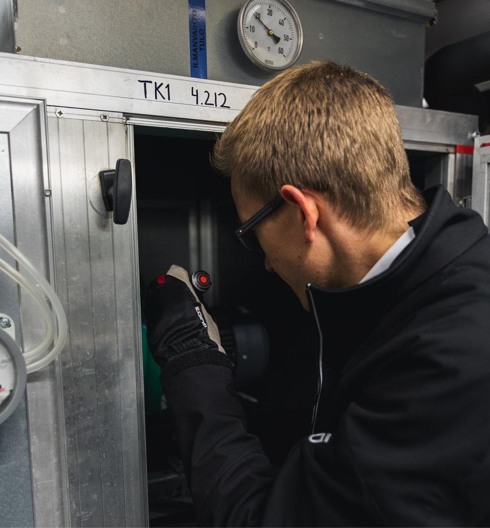 Korjaamme ja huollamme pikkuviat ennen kuin niistä kasvaa suuria. Huollon tavoitteena on, että järjestelmä toimii vakaasti ja kuluttaa mahdollisimman vähän energiaa. Se pidentää myös laitteiston elinkaarta ja vähentää esimerkiksi vesivahingon riskiä merkittävästi.